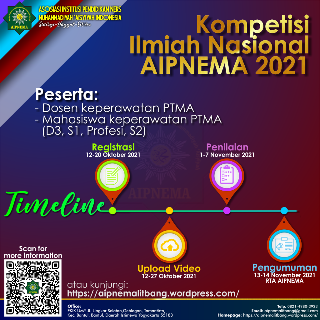 Asosiasi Institusi Pendidikan Ners Muhammadiyah ‘Aisyiyah (AIPNEMA) melalui kerjasama antara Bidang Pengembangan, Penelitian dan Pengabdian, Publikasi dan Jurnal bersama Bidang Pengembangan Kemahasiswaan dan Lulusan mengadakan kegiatan “Kompetisi Ilmiah Nasional AIPNEMA 2021”. Kegiatan tersebut dapat diikuti oleh dosen dan mahasiswa. Tujuan kegiatan tersebut adalah memfasilitasi peningkatan karya / luaran berupa prestasi akademik dosen dan prestasi akademik mahasiswa pada Program Studi Keperawatan PTMA.